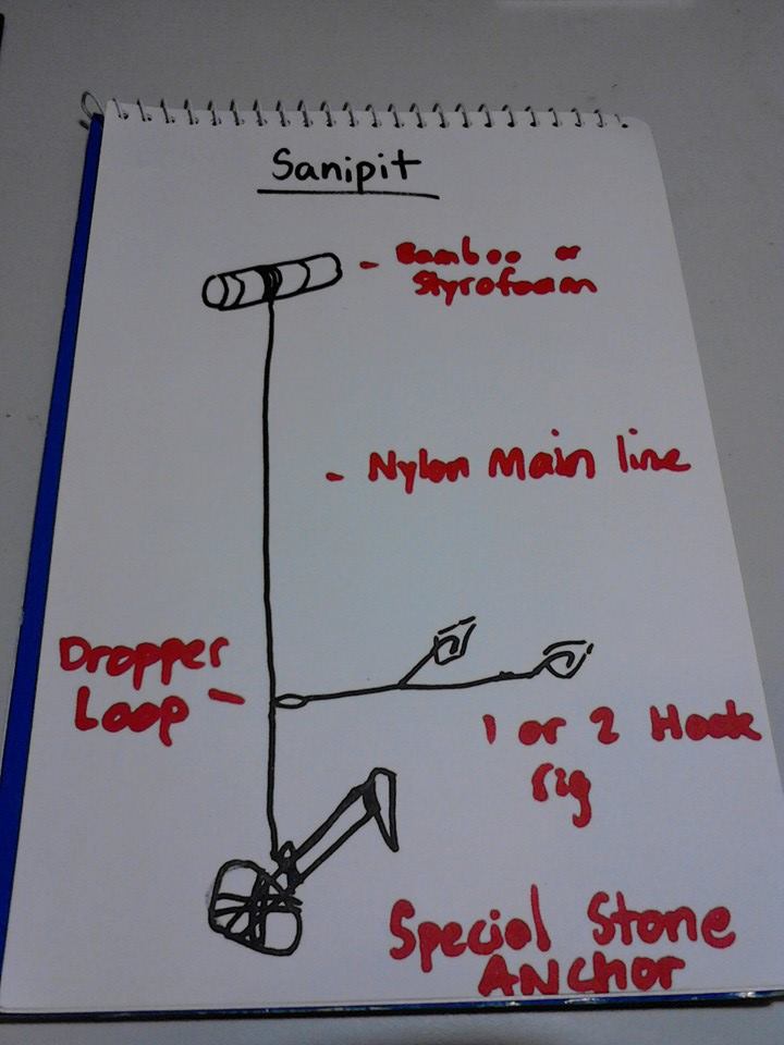 Fishermen normally place multiple Sanipit rigs at one time around a general area. This helps them to triangulate spots that hold fish. There are some difficulties with this fishing method. Rigs can get hopelessly snagged which causes loss of line and some times tackle. Large fish can also drag the buoy away or cut the mainline. Theft by other fishermen is also another problem which is why many place the Sanipit at dusk and collect at dawn.