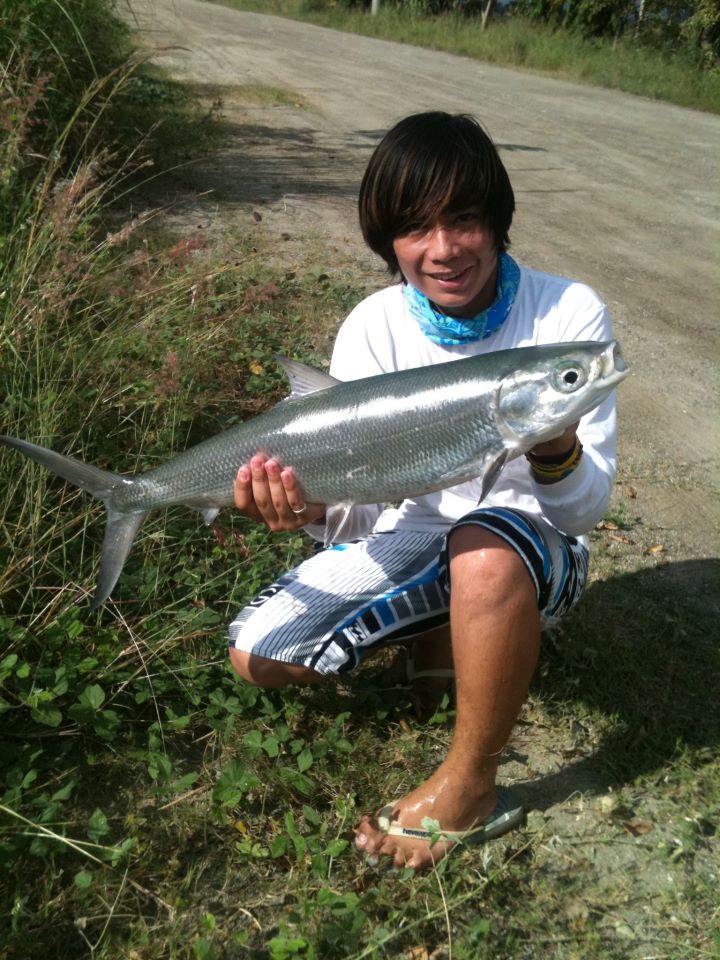 This is the national fish of the Philippines. It is a saltwater species that can also be found in freshwater. These fish are farmed through out the country in ponds along the ocean for food. It is also a popular game fish due to its strong runs. It however feeds mainly on algae, small invertabrates, zooplankton and fish eggs. Anglers target these fish mainly in stocked ponds with dough bait, bread and occasionally fly fishing flies, however they can be caught in the in the wild along the coast around reefs and in mangroves, estuaries, and bays. This large Bangus in the picture above was caught by Josh in Cebu. Large adult Milkfish are also called Awa.